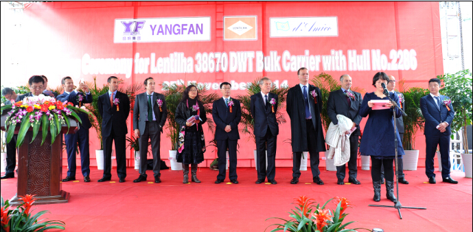 A naming ceremony was held for the 38670DWT bulk carrier H2286 which built by Zhoushan Shipyard on November 25. Patrice de Carmaret. The Chairman of Dora Investimentos Ltd, the Sponsor Ms. Zhang Lijia and Li Mingdong,the chairman of Yanfan group attended the ceremony.