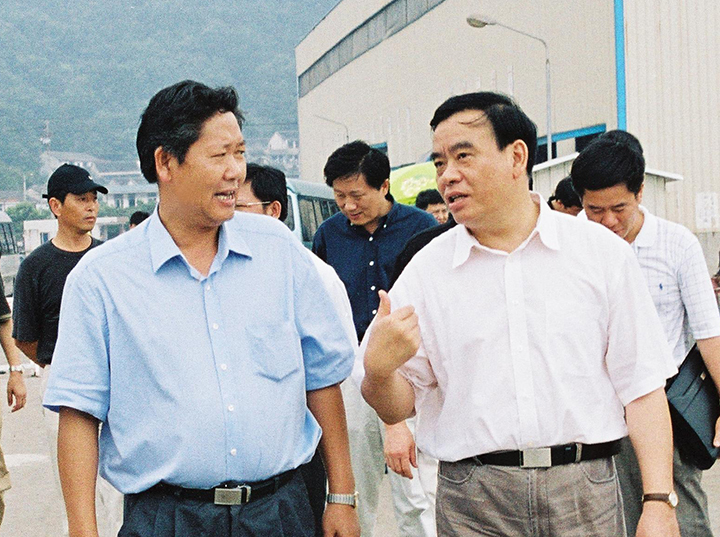 2003年8月8日,浙江省委副書記、省長呂祖善(右一)來“揚(yáng)帆”視察,要求揚(yáng)帆集團(tuán)依托舟山的港口和區(qū)位優(yōu)勢,拓展發(fā)展思路,創(chuàng)新管理機(jī)制,抓住船舶工業(yè)發(fā)展的有利機(jī)遇,進(jìn)一步做大做強(qiáng)。