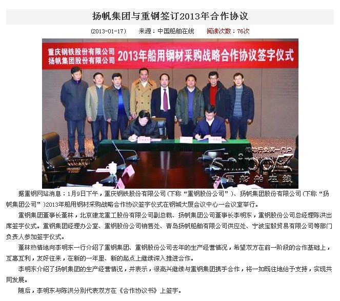 中國(guó)船舶在線:揚(yáng)帆集團(tuán)與重鋼簽訂2013年合作協(xié)